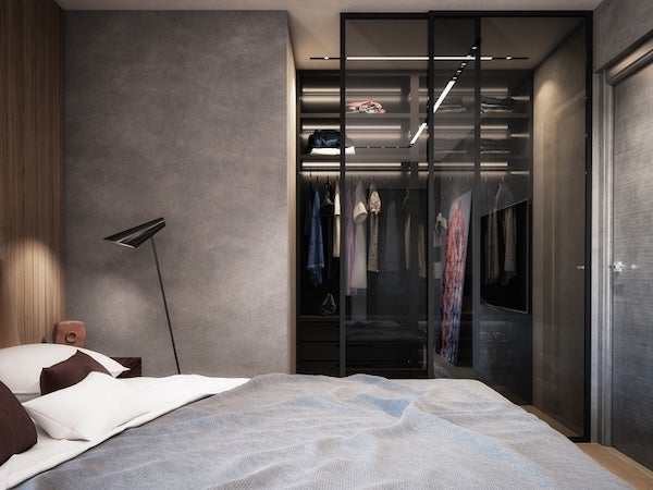 透明的玻璃趟門視覺上可以讓睡房更通透,避免規劃衣帽間後造成睡房過於狹窄擁擠,還可以預防衣物沾染灰塵,是最常見的衣帽間隔間方式。