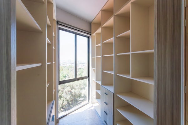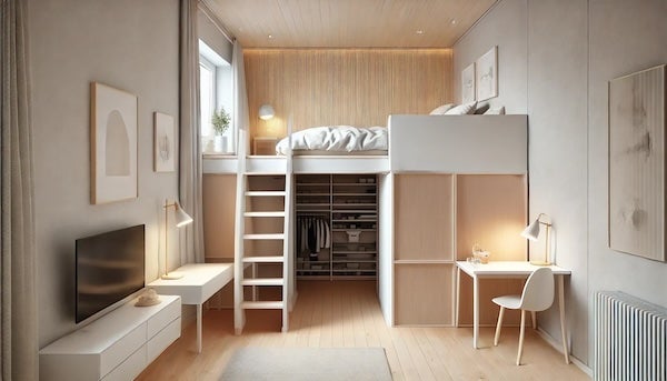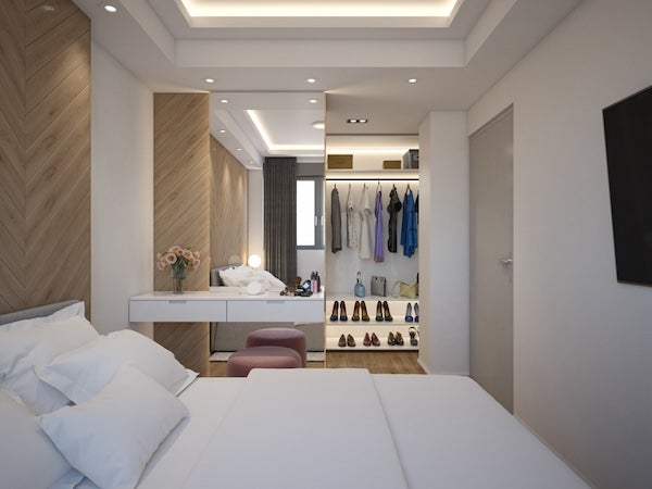 細單位睡房可以善用畸零空間,打造舒適的更衣空間,例如:高樓底的住宅睡房可以利用夾層將上方規劃成睡眠區,下方則規劃成衣帽間。