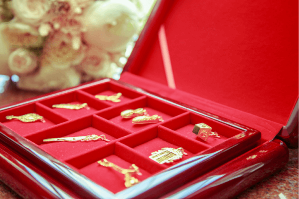 - 金器:*四飾金或五飾金皆可,由未來婆婆贈送給新娘,作為見面禮,通常包括手鐲、項鍊...等。