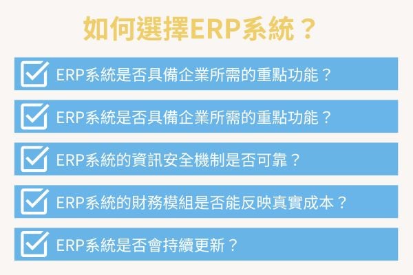 ERP 系統有很多類型,且每個系統提供的模組選擇也各有不同,除了選擇需要的功能,最重要的是了解公司在營運中遇到哪些問題?有哪些相對應的功能可以解決問題?您可以與經驗豐富、熟知 ERP 系統的 ERP 規劃師聯絡,請顧問評估或向顧問諮詢相關資訊,例如:現有的企業流程遇到哪些問題,公司需要的基本功能有哪些,是否需要電子發票、倉儲或業務流程管理…等整合功能,藉由顧問了解 ERP 系統相關的資訊後,再依照您的預算選擇合適的系統與功能模組。