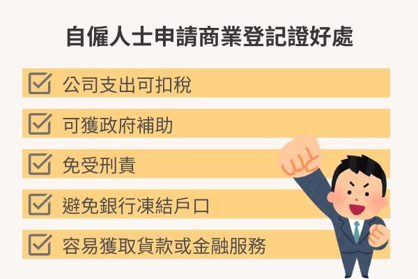 若自僱人士長期使用個人銀行戶口進行大額交易,可能會被銀行視為可疑交易並凍結戶口;取得商業登記證後,便可在銀行開立商業戶口,避免因為帳目不明而遭銀行封賬。