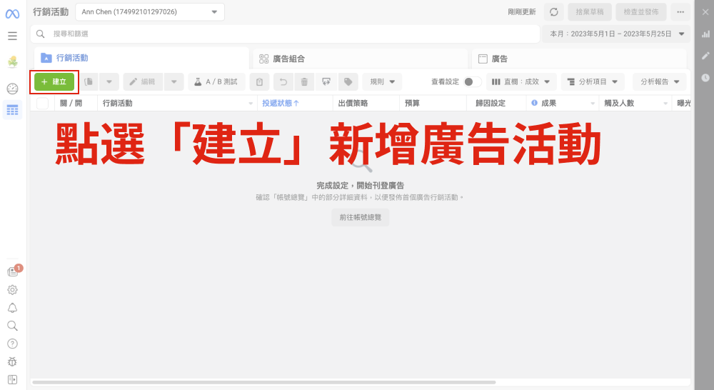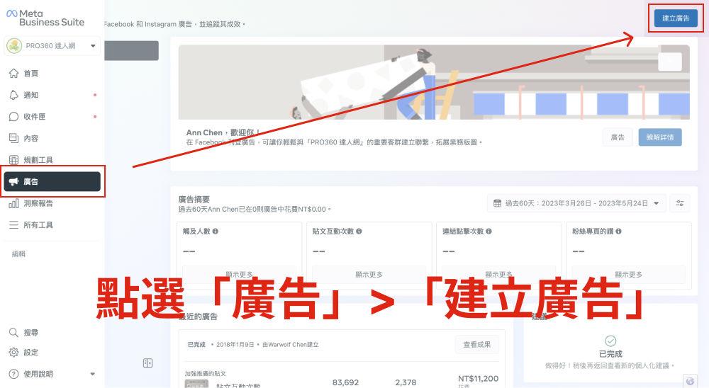 步驟一,選擇左側工具選單中的「廣告」並點選右上角的「建立廣告」。