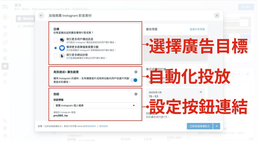 以「加強推廣」功能投放廣告不需要額外製作廣告素材,您可以從已發布的內容中選擇要加強推廣的貼文或限時動態,系統會自動選擇最適合的版位並將內容調整為合適的版面大小,您只需要設定廣告目標、行動呼籲按鈕連結、廣告受眾、廣告發佈時間和預算即可開始投放廣告。