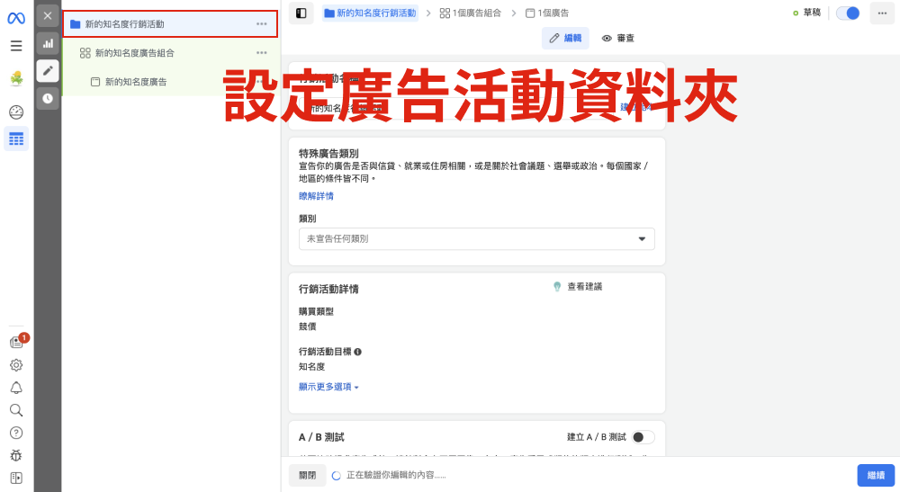 步驟四,設定廣告活動資料夾,包含:廣告活動名稱、是否為特殊廣告(例如:信用貸款、就業、住房或是社會議題、選舉、政治... 等相關廣告)、設定廣告活動預算上限、是否進行A/B測試...等,根據不同廣告目標可設定的功能會有些微差異。