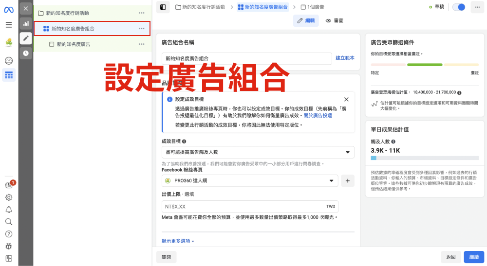 步驟五,設定廣告組合,包含:廣告單次出價上限、是否需要系統自動為您提供的廣告素材生成最佳廣告樣式、單日預算、廣告排程、廣告受眾的細節設定和是否手動選擇版位...等,根據不同廣告目標可設定的功能會有些微差異。