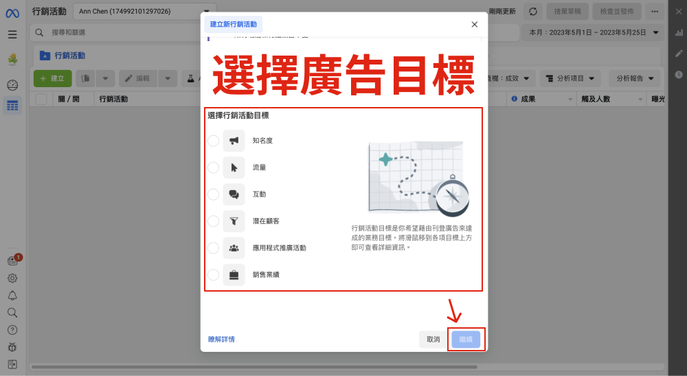 步驟三,選擇您的廣告目標並點選「繼續」。