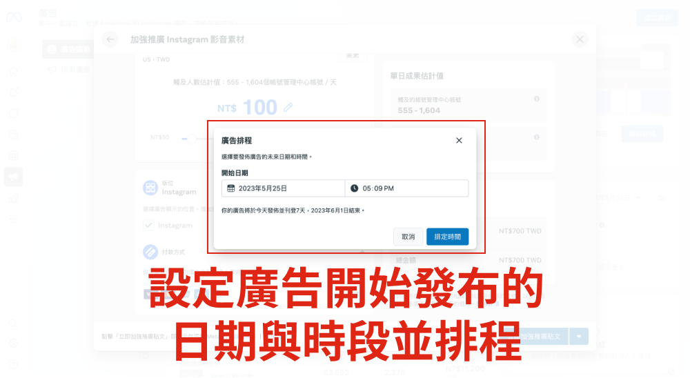 步驟七,設定廣告開始發布的日期與時段並排程。