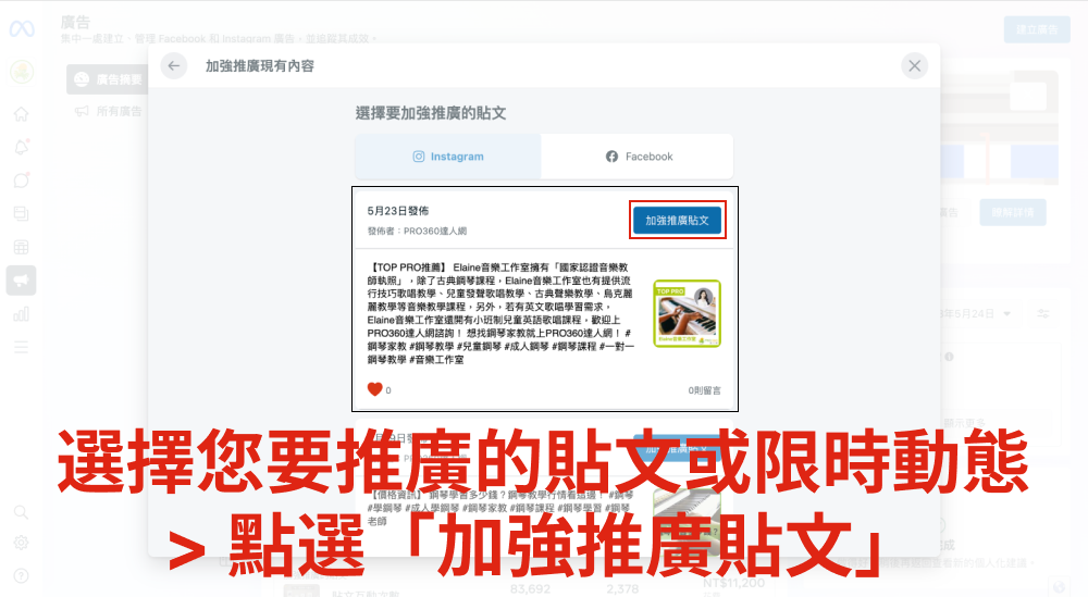 步驟三,選擇您要推廣的貼文或限時動態並點選「加強推廣貼文」。