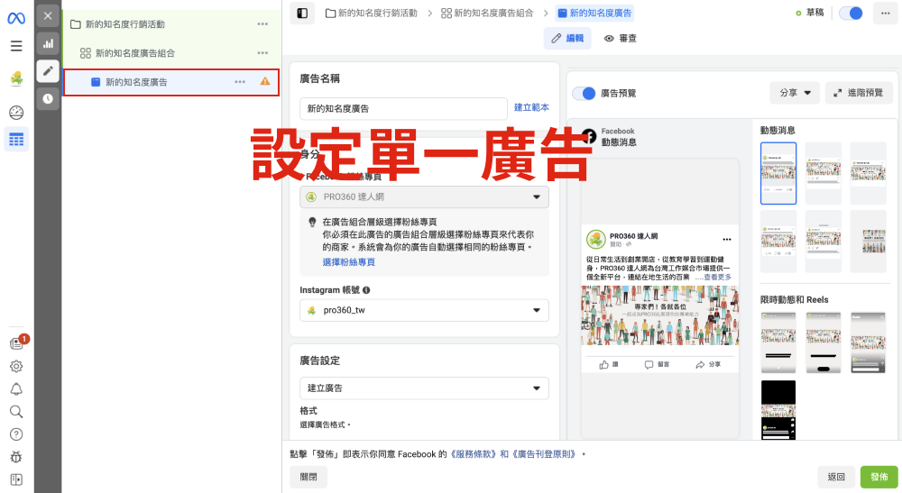 步驟六,設定單一廣告,包含:設定廣告要單一圖像或影片、輪播或是精選集...等廣告格式,設定廣告素材的文字、音樂、連結網址,也可以設定是否要啟動自動翻譯以觸及其他語言使用者,最後還可以設定廣告追蹤,後續可利用廣告追蹤查看使用者看到廣告後的行動。