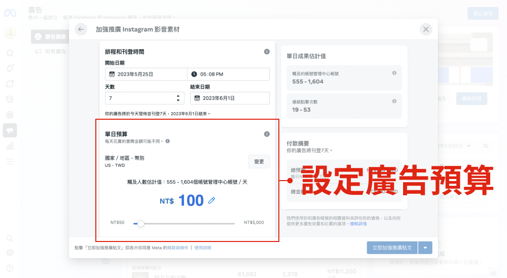 IG打廣告費用約為單日$8-$7,800元,IG廣告屬於廣告競價機制,也就是每次廣告投放都會因應競爭該時段、客群的廣告數量多寡而有價格高低。在IG打廣告可以自行設定預算,單日最低預算只要$8元即可投放廣告;若是要能看到廣告投放效果,建議最少單日預算$200-$300元;最高預算上限當日則可選擇$7,800元。