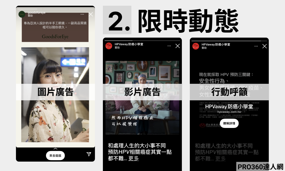 - 影片廣告:影片廣告是以製作影片的方式投放在限時動態版位,可直接手動調整影片原檔版面大小,將影片置入限時動態搭配文字展現,也可以製作符合限時動態尺寸的全版影片,同樣可搭配行動呼籲按鈕,讓目標受眾點擊按鈕引導至目標連結。