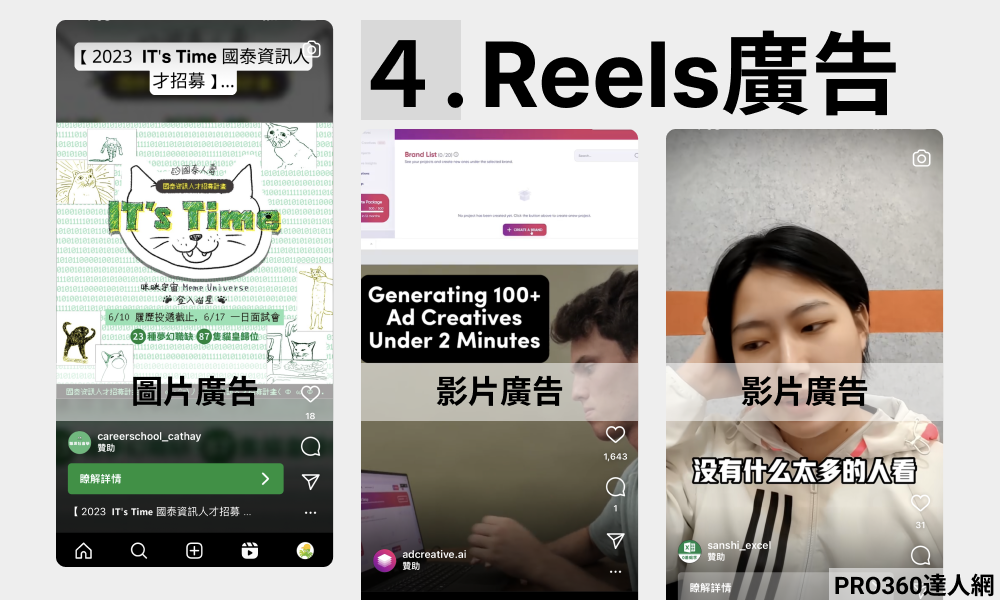 Reels是Instagram平台的短影音,由各個創作者發布、分享他們製作的短影片,使用者在點擊下方的「影片」圖示時,便會進入短影音的播放版位,短影音版位中不會只播放使用者目前追蹤的帳號,而是會根據系統分析的結果顯示用戶可能有興趣的所有短影音內容,雖然Reels是IG的短影音版位,但並沒有限制必須是影片才可投放,一般的圖文也可選擇投放廣告在Reels版位中。