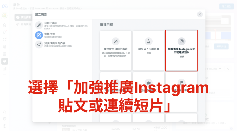 步驟二,選擇「加強推廣Instagram貼文或連續短片」。