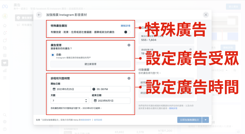 步驟四,選擇您的廣告設定,包含:行銷目標、是否開啟自動化投放、設定行動呼籲按鈕連結、是否為特殊廣告(例如:信用貸款、就業、住房或是社會議題、選舉、政治... 等相關廣告)、設定廣告受眾以及設定廣告發佈時間。