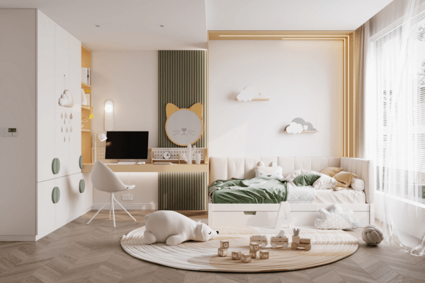 黃色活潑、綠色則讓人放鬆,若想讓孩子成長於更貼近自然環境,可選擇大自然中常見的陽光黃、樹木綠...等顏色再搭配木色傢俬。