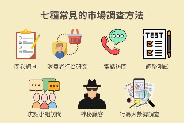 市場調查要怎麼做?如何才能有效了解公司產品及商業模式是否受到消費者青睞?以下為您介紹七種常見的市場調查方法,協助您有效了解目標群體的消費行為及喜好: