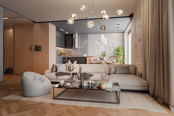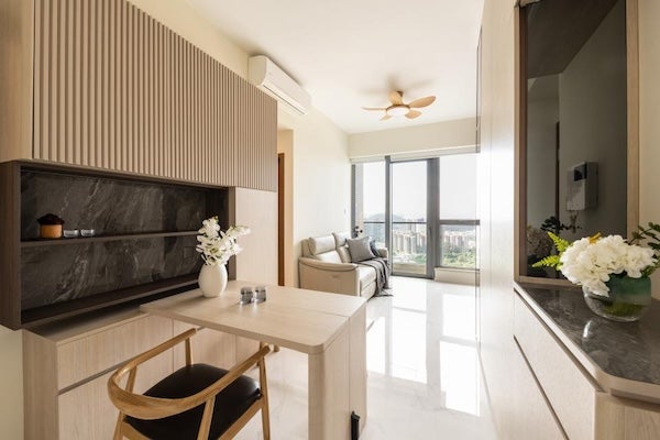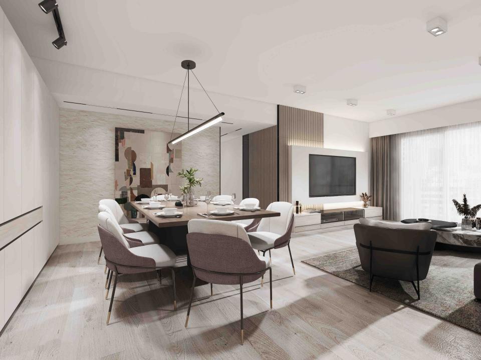 設計師在單位中採用大量的淺色物料,讓整體空間看起來更明亮,餐廳區域使用設計感十足的餐桌椅,搭配簡約風格吊燈並在餐廳視覺牆上掛上藝術畫;客廳放置輕奢風格的沙發與雲石茶几,搭配簡潔的電視牆設計,營造極具藝術氣息的現代風開放空間。