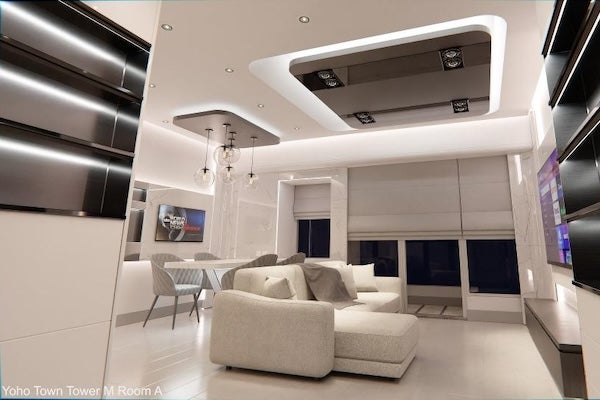 設計師在此現代風客廳範例中使用白色作為主色調,搭配亮黑色的層架與間接照明,不僅讓客廳看起來時尚且具科技感,也讓空間更有層次感,使整體空間顯得明亮且寬敞。