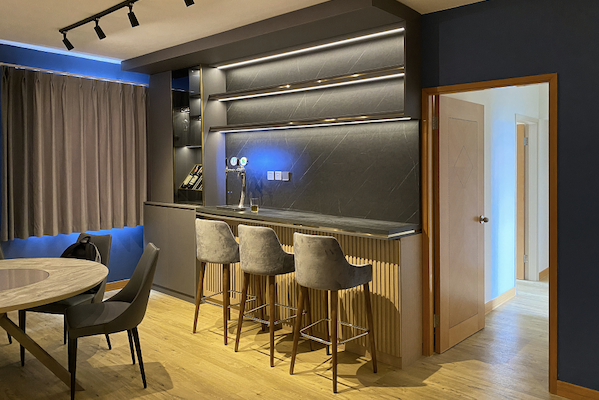 此案例為混合現代風與北歐風元素的混搭設計,設計師設計牆邊吧台並以黑色雲石裝飾,層板外框以金屬線條點綴搭配燈條,不僅可以展示酒瓶和其他裝飾品,還能凸顯吧台區的輕奢質感,使整體飯廳空間更簡約時尚。