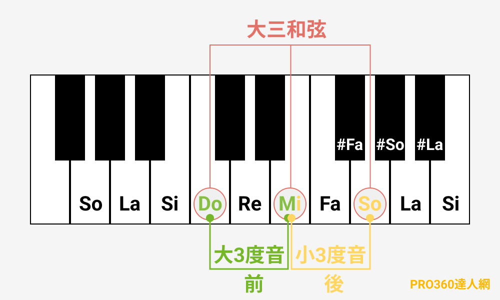 三和弦由根音、3音與5音共三個音組成,分為大三和弦、小三和弦與增三和弦、減三和弦,這邊以大小三和弦做介紹: