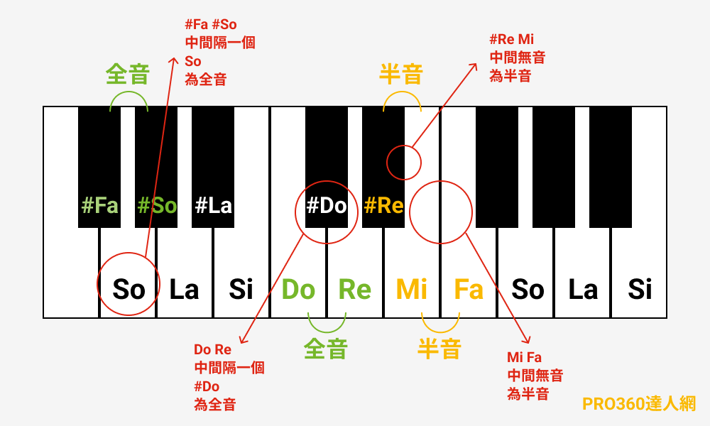 認識和弦之前,要先了解全音、半音才能算「幾度音」,鋼琴鍵中黑鍵、白鍵都是一個音,音與音之間有隔一個音稱作「全音」,沒有隔音稱作「半音」。