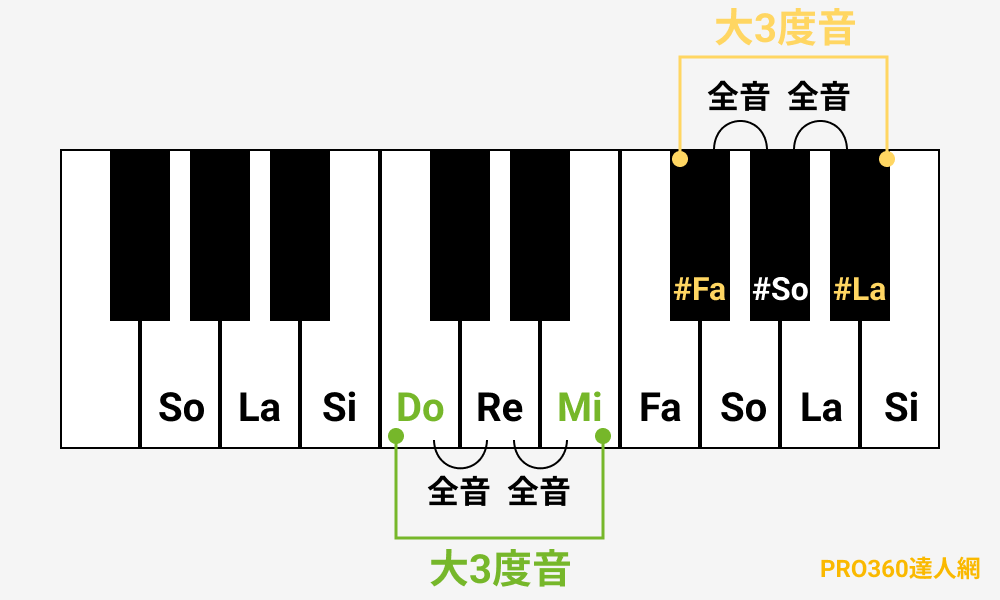 音與音之間隔兩個「全音」為大三度音。