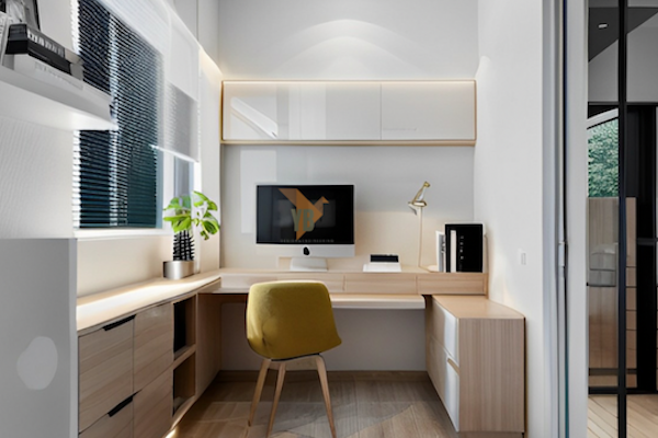 設計師在北歐風書房中採用大量的白色和淺木色,營造明亮而舒適的氛圍,空間中規劃大量的收納空間,讓面積不大的書房更有空間感,此外,設計師還在書房中擺放綠色植栽,為北歐風房間增添自然氣息。