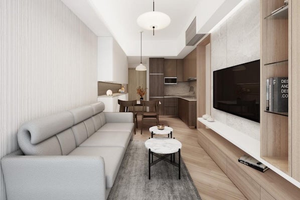 此案件為簡約北歐風設計,空間內沒有過多的點綴與裝飾,以白色和淺木色為主調,使空間更明亮寬敞,淺米色雙人梳化搭配灰色抱枕,不僅增加舒適度,也提升視覺層次,整體設計簡潔大方,完美體現北歐風格的特色,為居住者創造舒適溫馨的生活環境。