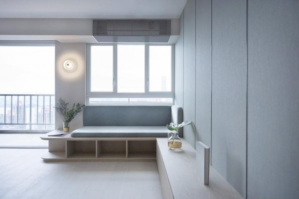 此北歐風裝修案件中,設計師以白色為主色調,搭配淺藍色的牆面與臥榻軟墊,營造清新寧靜的空間氛圍,臥榻底部設計成開放式儲物空間,既實用又美觀,牆面上的簡約燈具和盆栽點綴,為空間增添了些許生氣和自然元素,空調巧妙地隱藏在牆面上方,保持整體設計的簡潔統一,展現北歐風設計的簡約美學。