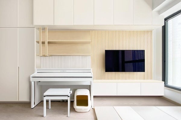 此北歐風裝修案件中,設計師在電視牆規劃大量的白色櫃體,令灑進的陽光反射照亮室內,讓客廳空間通透明亮,電視後方的牆面以木條裝飾,使電視牆更具層次感和視覺感,整體展現簡約、清新的視覺效果。