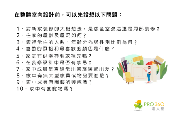 裝修新家的目的是為了給家人居住開心且方便使用的生活空間,因此在準備家居裝修前,首先要先整理家中成員對於新家的想法與需求,才能讓家中每個人都開心入住,以下列舉10項在進行整體室內設計前的基本問題供您自我檢視: