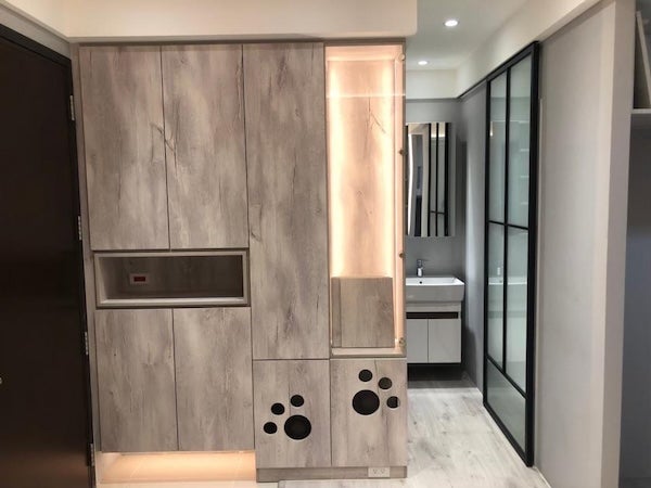 貓咪喜歡在安靜、安全的地方休息,設計時可以將訂造櫃結合貓洞與貓砂盆,為貓主子打造私密的休息與如廁空間,也可以將貓洞與家中的其他房間相連,讓貓咪可以透過貓道穿梭家中的每個角落。
