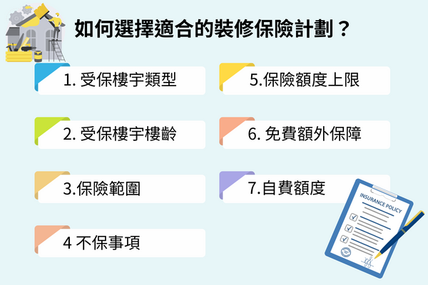 市面上有許多保險公司提供各式的裝修保險方案,您可以透過以下7點選擇最適合的裝修保險計劃:
