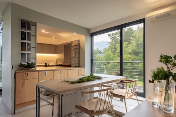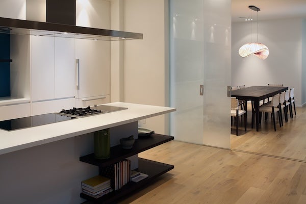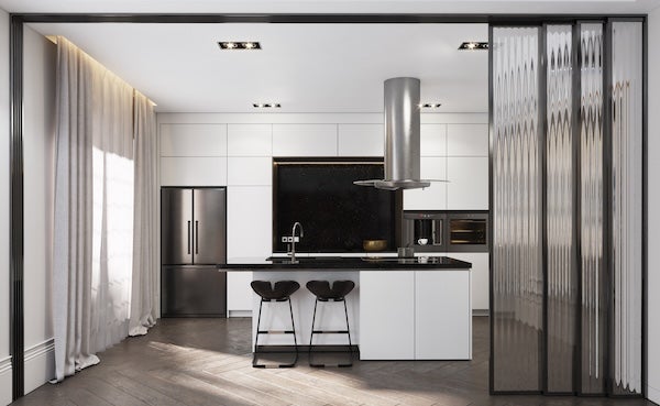 有別於完全沒有間隔的開放式廚房,半開放式廚房可以利用玻璃間牆或趟門,避免油煙飄散至客廳或餐廳。