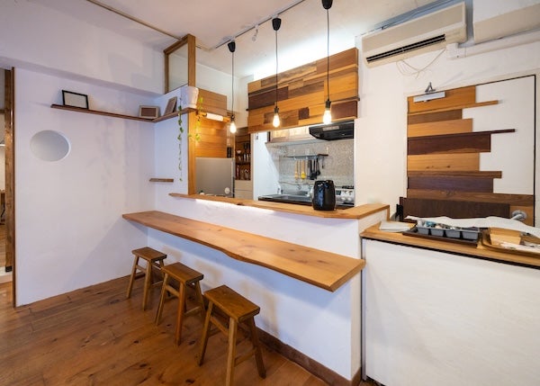 利用中島設計半開放式廚房是日本常見的廚房設計手法,透過架設半高牆、擺放半高櫃或是設計單側加高的廚房中島吧台,讓客廳與餐廳的使用分區更明確,同時也能稍微遮掩凌亂的廚房檯面,避免影響客廳或餐廳的美觀。