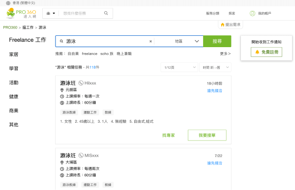 常見的補習平台大多以升學科目為主要配對案件,但PRO360達人網擁有多樣化的補習科目可供選擇,包括:運動課程、樂器補習、才藝興趣班、電腦課程、學術科目、語言檢定課程...等多元化的教學機會,導師可免費註冊,且平台不設有評分系統,對新手教練相對友善。PRO360為每類課程設立專屬的問卷,供學生或家長填寫詳細的需求,提高您案件適配的機率,只要有消費者發布徵求游泳教練的案件,您即可依照案件條件選擇是否報價,報價費用則依照課程的類別設有不同的收費標準。