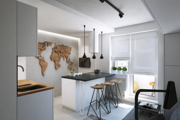 - 強調區域功能:開放式廚房可以在廚房空間打造容易清潔的烤漆玻璃特色牆,客廳空間則可使用令人放鬆的木材特色牆,藉由不同的特色牆面強調區域功能。