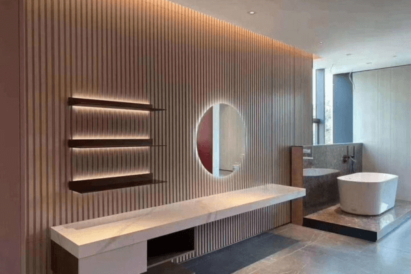 - 增加空間感:以通透的玻璃或能反射光線的鏡面製作特色牆,可以有效增加室內空間感。