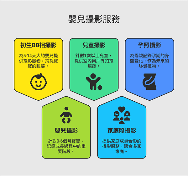 嬰兒攝影服務通常針對0-6個月左右的寶寶,攝影師能夠為您記錄孩子成長過程中的重要階段,如:滿月或學習坐、爬、站立...等動作過程,嬰兒攝影的風格通常較為活潑,強調捕捉嬰兒的自然表情和可愛動作,攝影師亦會準備服飾、道具佈景...等,以拍攝精緻的照片。
